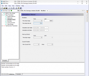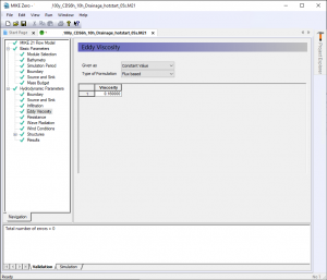 Pozostaje nam zmodyfikować plik m21, czyli samą symulację. Otwieramy ją, przechodzimy do Bathymetry i zmieniamy Type z Cold start na Hot start oraz plik na ten, który właśnie stworzyliśmy. W Simulation Period oraz Results musimy dostosować czas trwania symulacji i interwał zapisywania wyników. Ostatnią rzeczą do zmiany jest Eddy Viscosity*****, która jest zależna od rozdzielczości rastra, kroku czasowego i obliczamy ją według poniższego wzoru [źródło]: