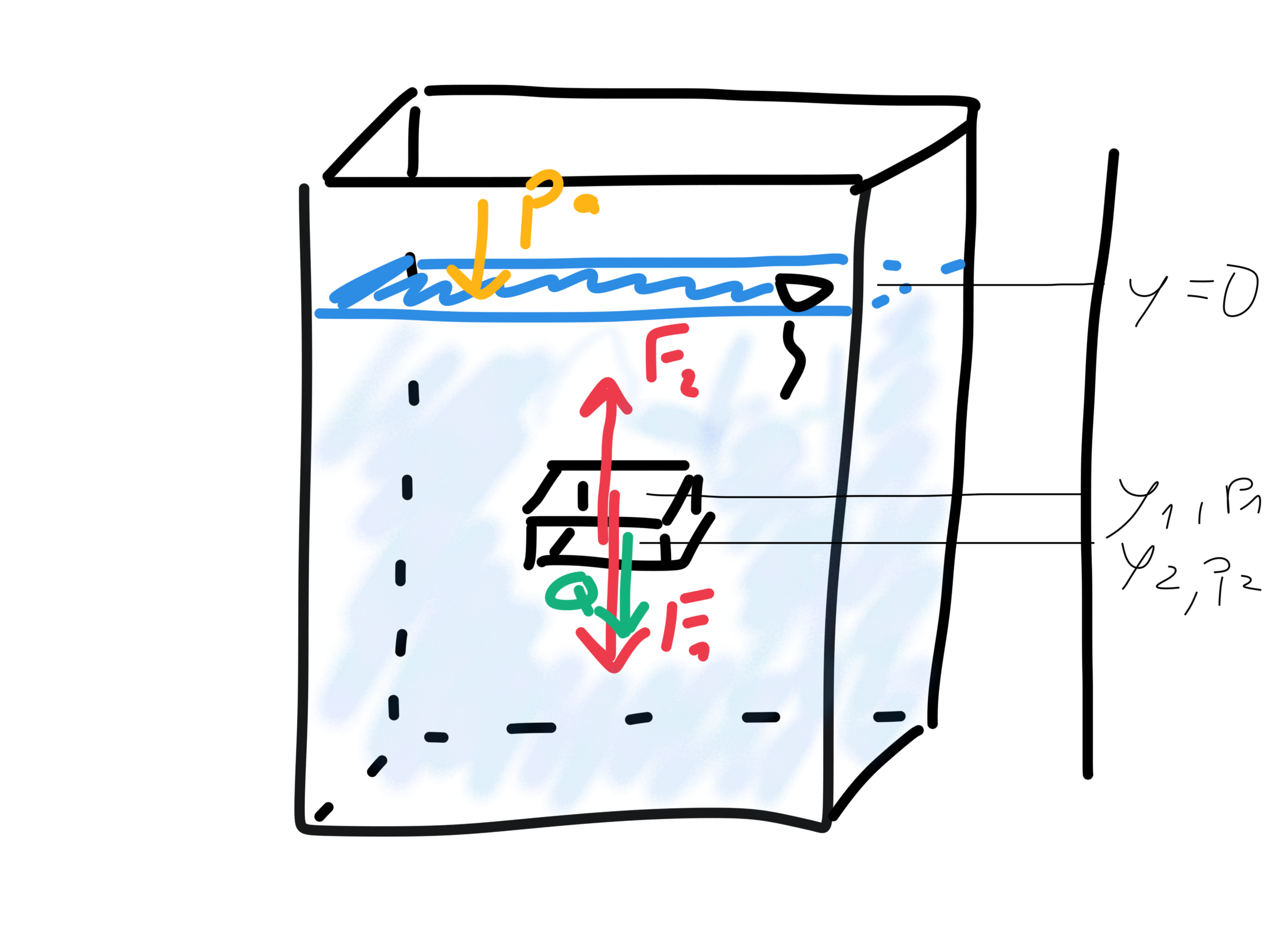 O ciśnieniu hydrostatycznym mówimy, gdy ciecz znajdująca się w spoczynku. Wyobraźmy sobie teraz naczynie, w którym zanurzyliśmy bryłę (brakuje mi lepszego słowa. Dodajmy też, że jest ona równoległościanem) i omówmy działające na nią siły: